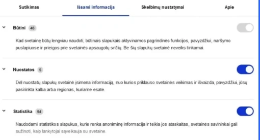 - Ar tinklalapio slapukai suskirstyti į kategorijas (pvz. būtini, statistiniai, rinkodaros)?